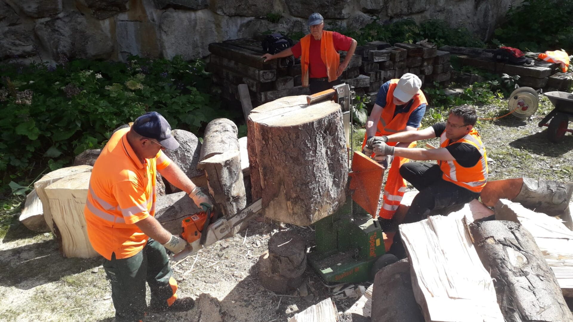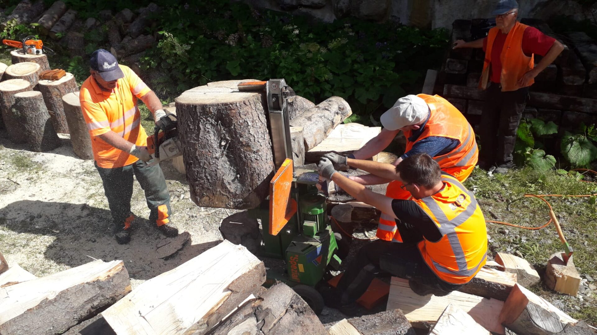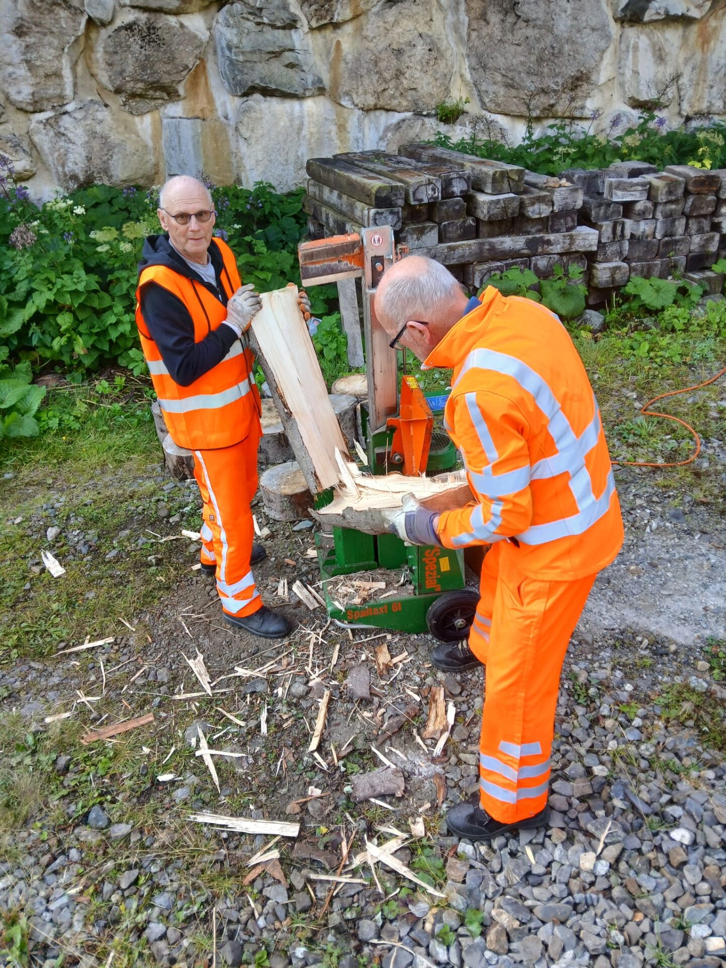 Vandaag zijn we weer in Gletsch, een beetje onze uitvalsbasis. Marius, Lei en Joop houden zich weer bezig met kloven van hout. De rest gaat snoeien, maar vandaag is dat net even anders. Want er is treinverkeer, en dus mogen we niet langs het spoor werken zonder een veiligheidsman. Maar Pius is aldus gekwalificeerd, dus dat komt goed. De eerste trein is de zogenaamde Wanderzug, ofwel de diesellok. Die vertrekt rond 10 uur uit Muttbach, dus tot die tijd kunnen we gewoon aan de slag. Maaiers Peter (Spruit) en Michel gaan met blazer Mario hard vooruit. Peter (Witkop) gaat met Stef en Thomas weer met de waterafvoergoot aan de slag.