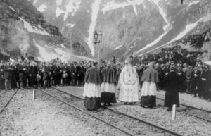 Gian-David en Kurt een boog aan het uitzetten zijn op het bestaande spoor. Net als gisteren worden we ook deze middag weer door de laatste trein opgepikt, die de chauffeurs van de bussen waarmee we vanochtend zijn gekomen, wederom afzet bij de passtraatovergang richting Muttbach. Dat voorkomt een heel stuk omhooglopen. Zo kunnen de chauffeurs de auto’s terugrijden over de pas. De bussen worden afgetankt, zoals gebruikelijk op de vrijdag, zodat de vrijwilligers van de volgende week op de maandag niet starten met een halflege tank.